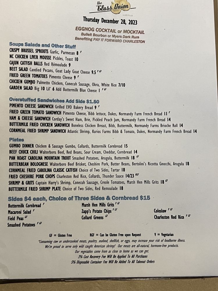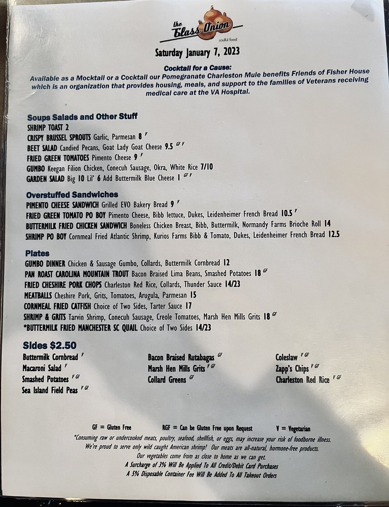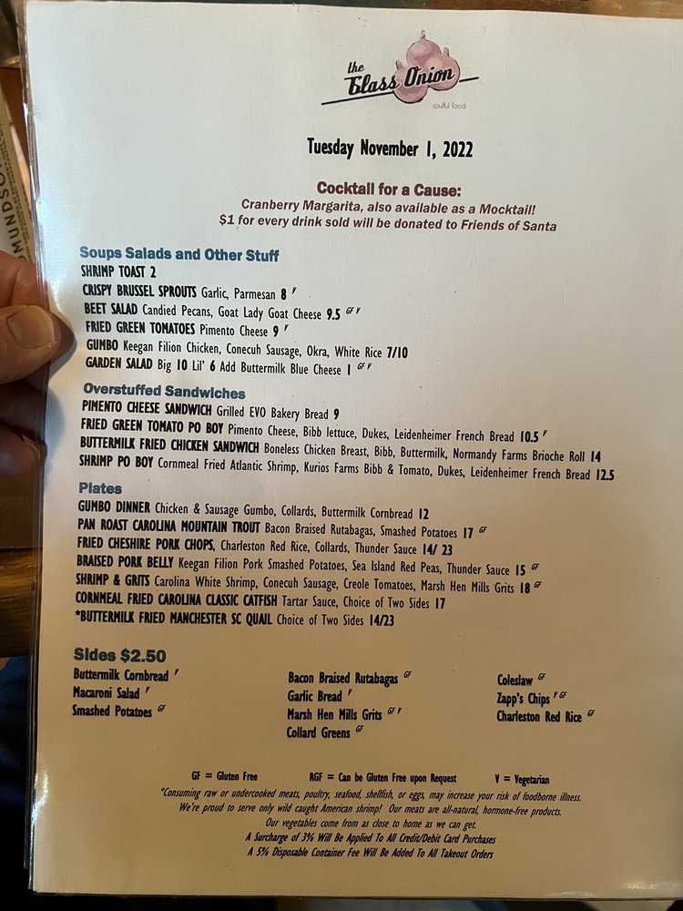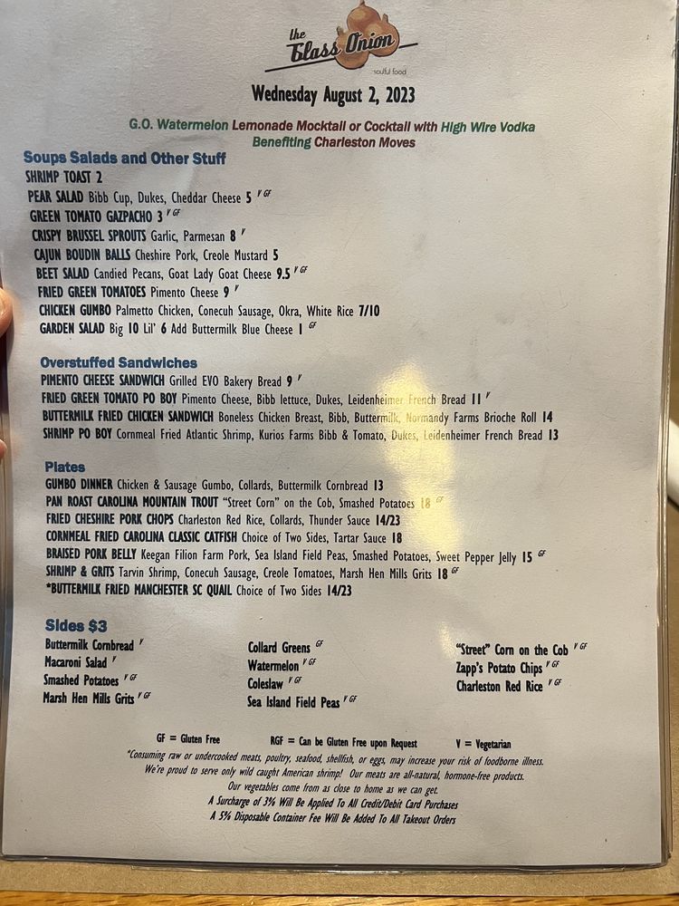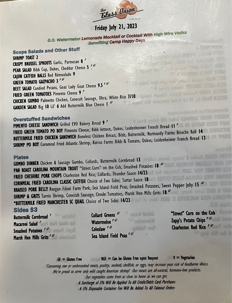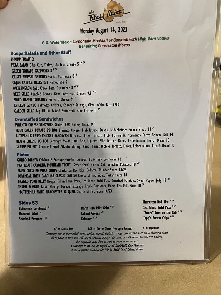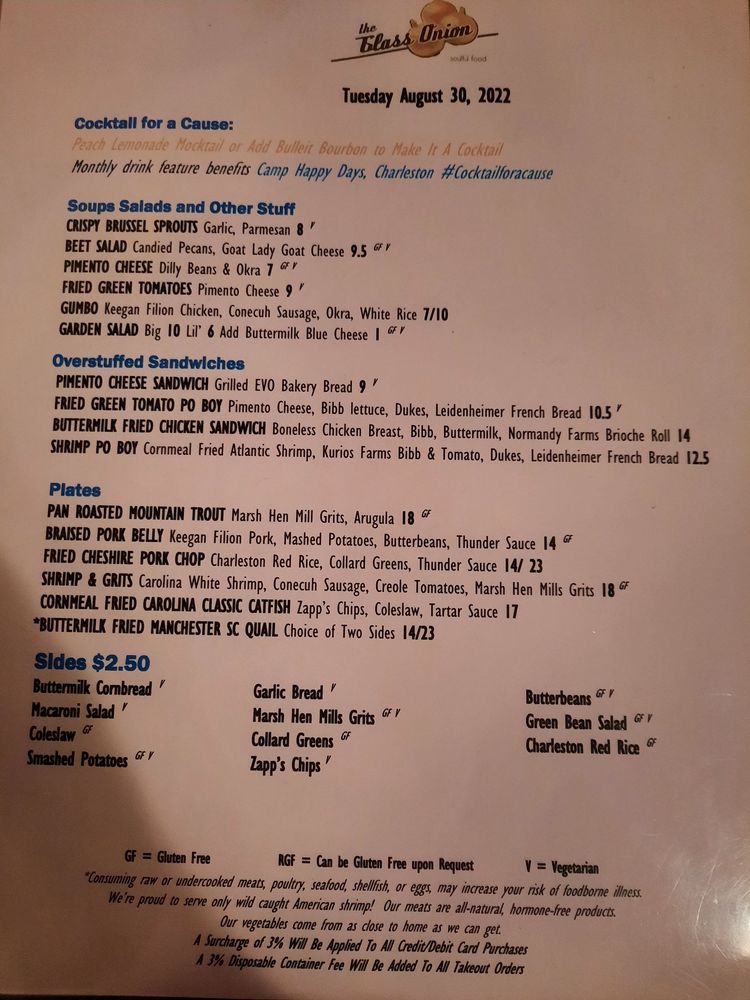 Introducing The Glass Onion, a Southern, Salad, and Sandwich restaurant located in Charleston, SC. Offering a farm-to-table vibe, The Glass Onion is known for its eclectic menu, featuring dishes like shrimp dip, pork chops, and gumbo. Customers rave about the delicious food and warm hospitality at this mom and pop shop. The menu includes must-try items like the shrimp po boy and fried green tomato sandwich, all served with homemade chips and sauces. With a full bar and options for vegan and gluten-free diners, The Glass Onion caters to a variety of tastes. Whether you're a fan of old-fashioned Southern cooking or looking for a unique dining experience, The Glass Onion is a must-visit destination.